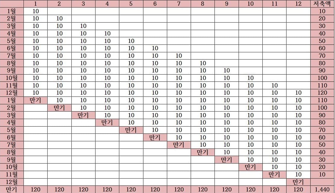 예를 들어 10만원씩 매달 1년짜리 적금을 가입한다고 가정할때를 표로 작성한건데.. "만기"라고 적혀있는부분이 보이실껍니다.