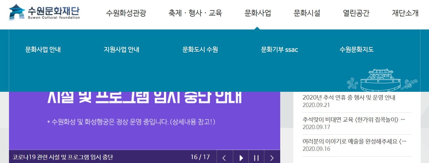 검색창에 "수원문화재단" 홈페이지 접속하시면 아래와 같은 화면이 나오는데.