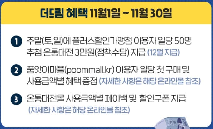 이외에도 11월 11일부터 30일까지 온통대전 이용자를 대상으로 추첨을 통해 할인이벤트를 진행한다고 합니다.