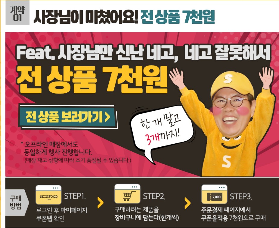 11월 6일부터 11월 19일까지 스킨푸드 회원에 한해 전제품을 7,000원에 구매할수 있는 쿠폰 3장을 발행한다고 합니다. 쿠폰은 1매당 제품 1개 사용할수 있으며, 쿠폰 3개를 다 사용했을때는 무료배송이라고 합니다.