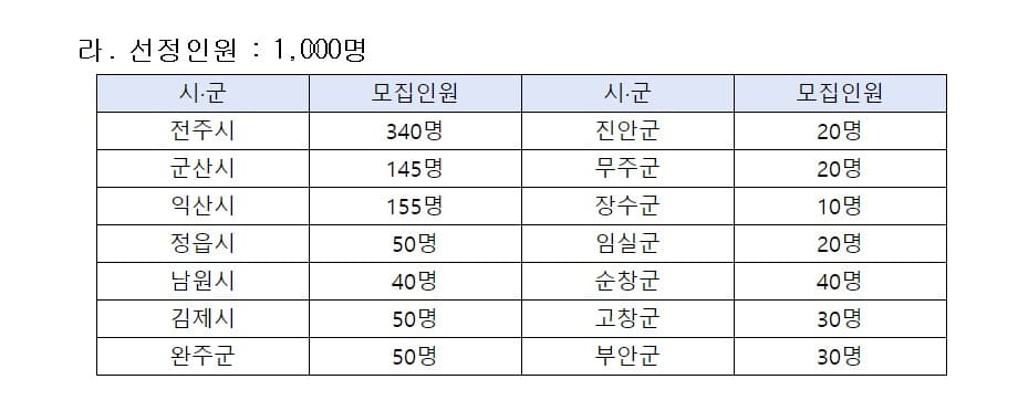 모집인원은 시군별로 다르므로 아래 이미지 참고하시기 바랍니다.