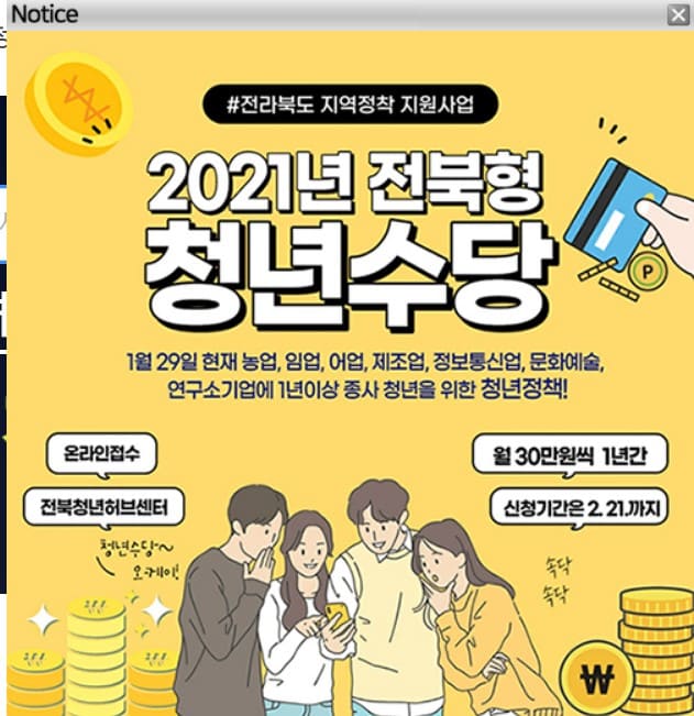매월 30만원씩 최대 1년간 지원받을수 있는 2021년도 전북형 청년수당 모집공고가 드디어 나왔습니다. 신청기간은 2021.01.29일부터 02.21까지이므로,